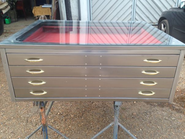 1950s stripped and polished steel plans chest. The top has been cut away to reveal the Moroccan Red painted first drawer through 6mm toughened glass.
