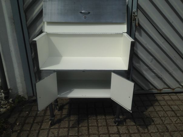The cabinet has one large cupboard at the bottom, with two doors, above that is another section with a hinged top that folds back.