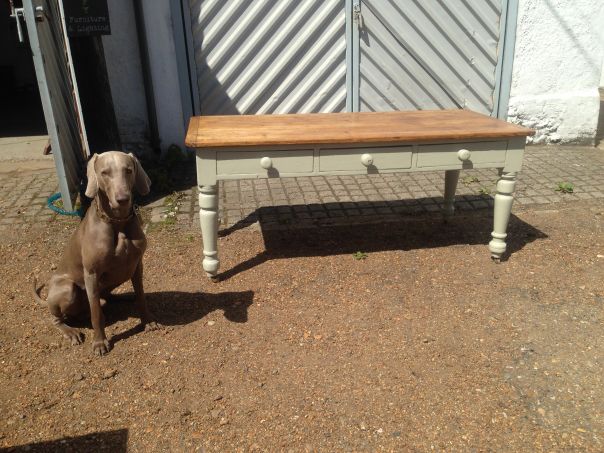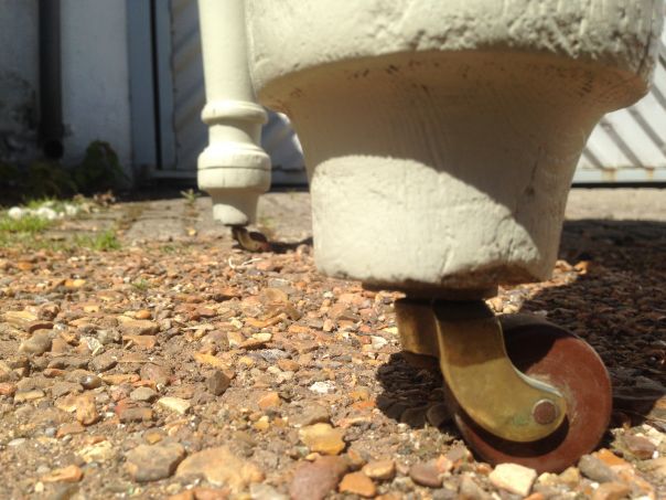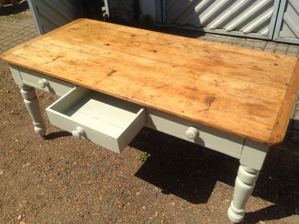 Three drawers, gorgeous wood top, and brass castors on the legs.