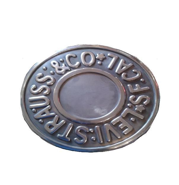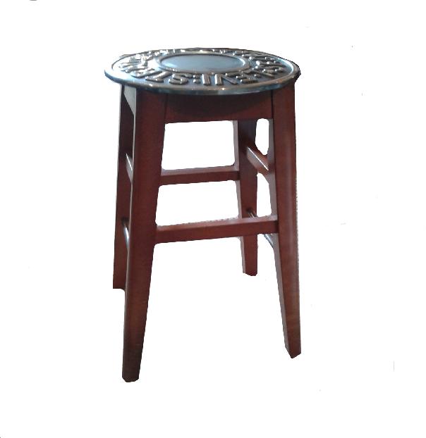 These stools are made by ourselves. The top is a cast aluminium copy of a Levis jeans button made in our local foundry. The raised letters are then polished and the disk is attached to a vintage wooden bar stool.