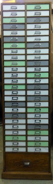 Stunning oak cabinet with 50 metal drawers and one large drawer at the bottom.