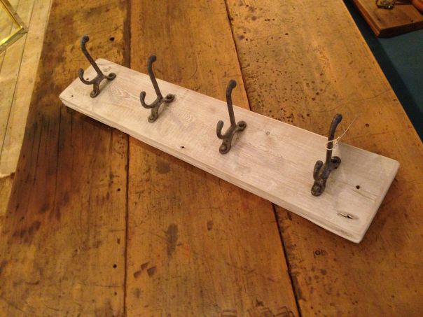 Cast iron hooks dating from the 50's/60's placed on beautiful reclaimed lime waxed Victorian sacking board