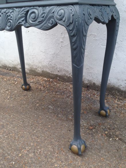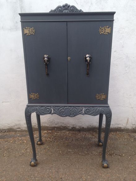 Beautiful Queen Anne style cocktail cabinet with lock and key, painted in Herringbone Grey with a Morrocan Red interior.